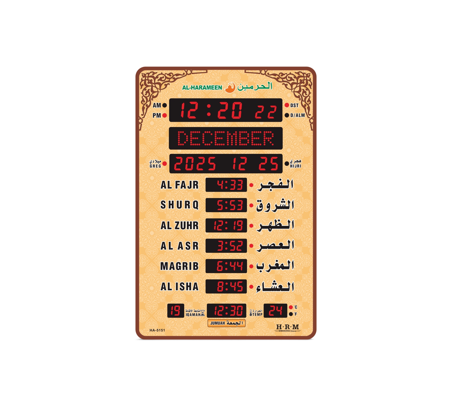 .تاتي بعدة احجام وشاشات عرض عقارب ورقمي لعرض الوقت والتاريخ ووقت الأذان معا